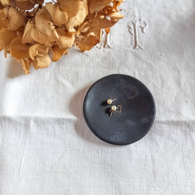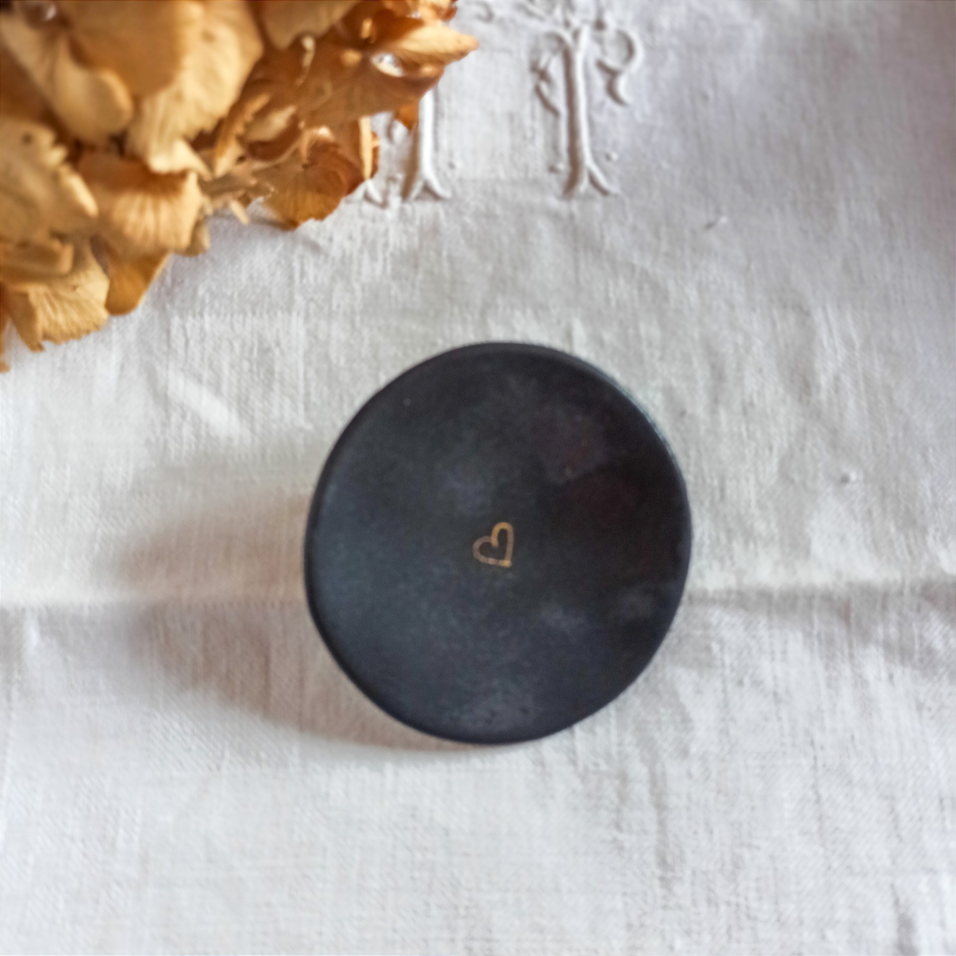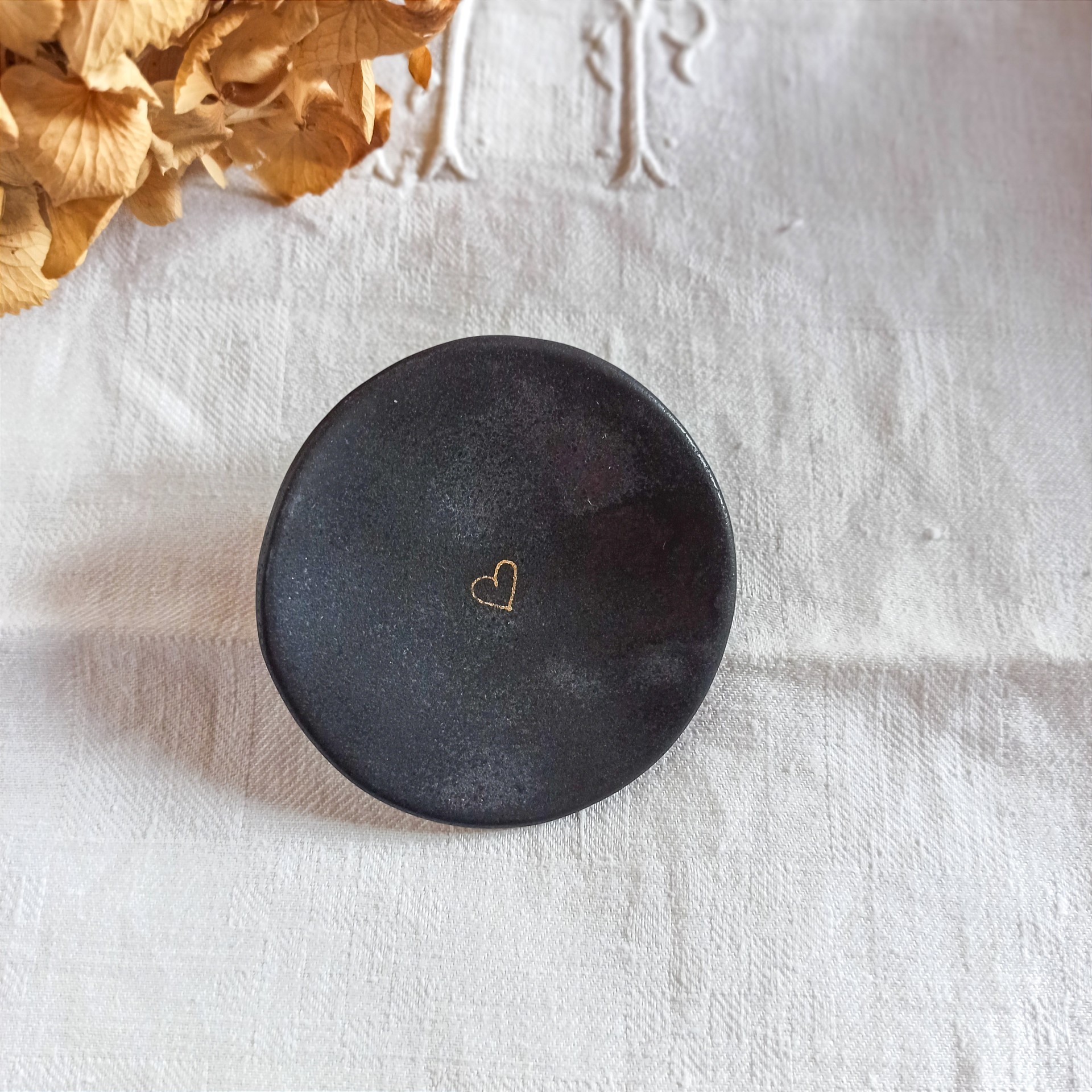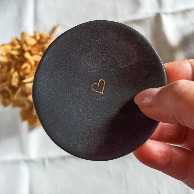 Vous trouverez de nombreuses utilisations pour cette petite coupelle, en porcelaine noire émaillée, de +/- 7,5 cm de diamètre, un petit coeur peint à l'or orne son centre.