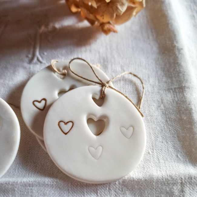 Ces diffuseurs de senteurs ou huiles essentielles sont ronds, en céramique, d'un diamètre de +/- 6,5 cm et ornés d'un des petits coeurs peint à l'or .