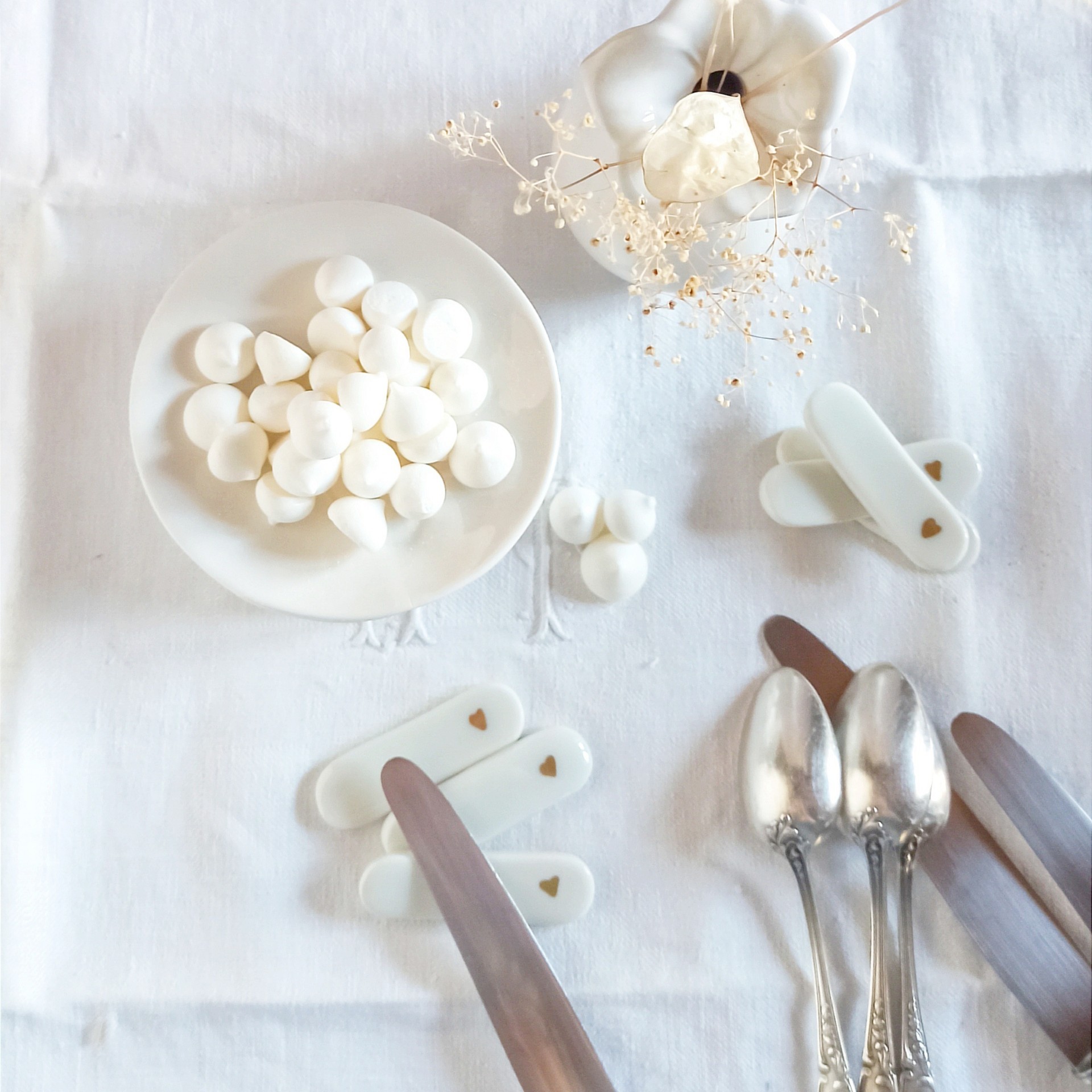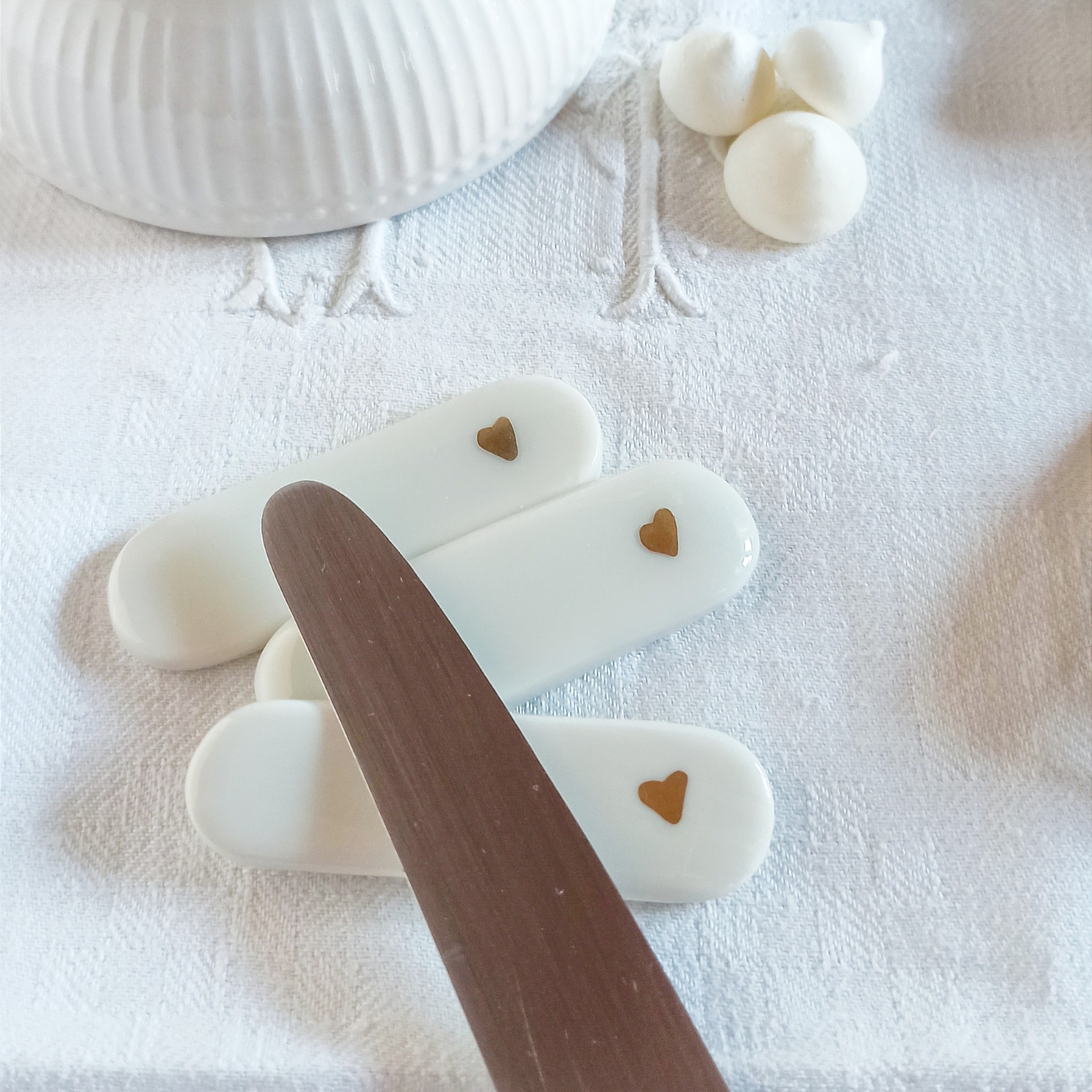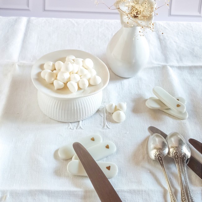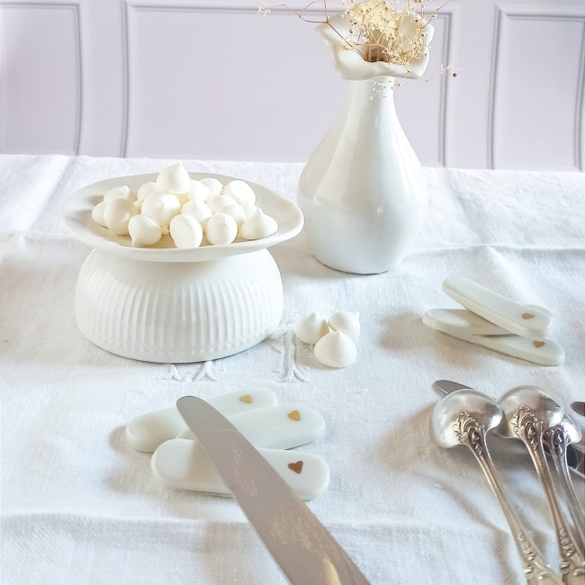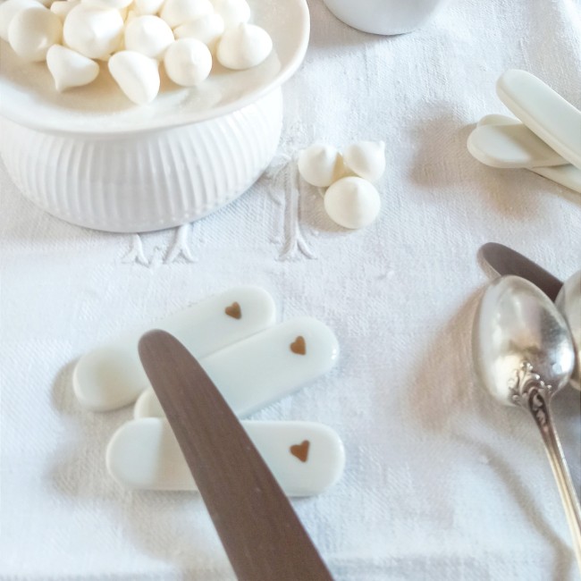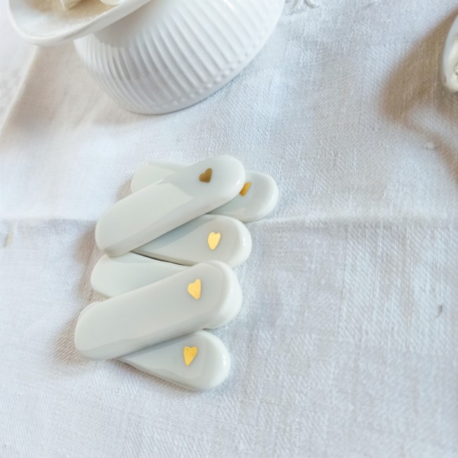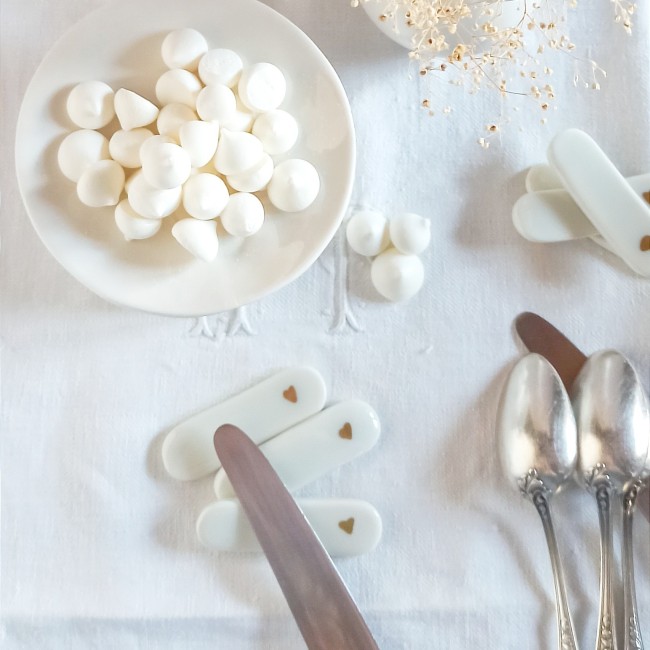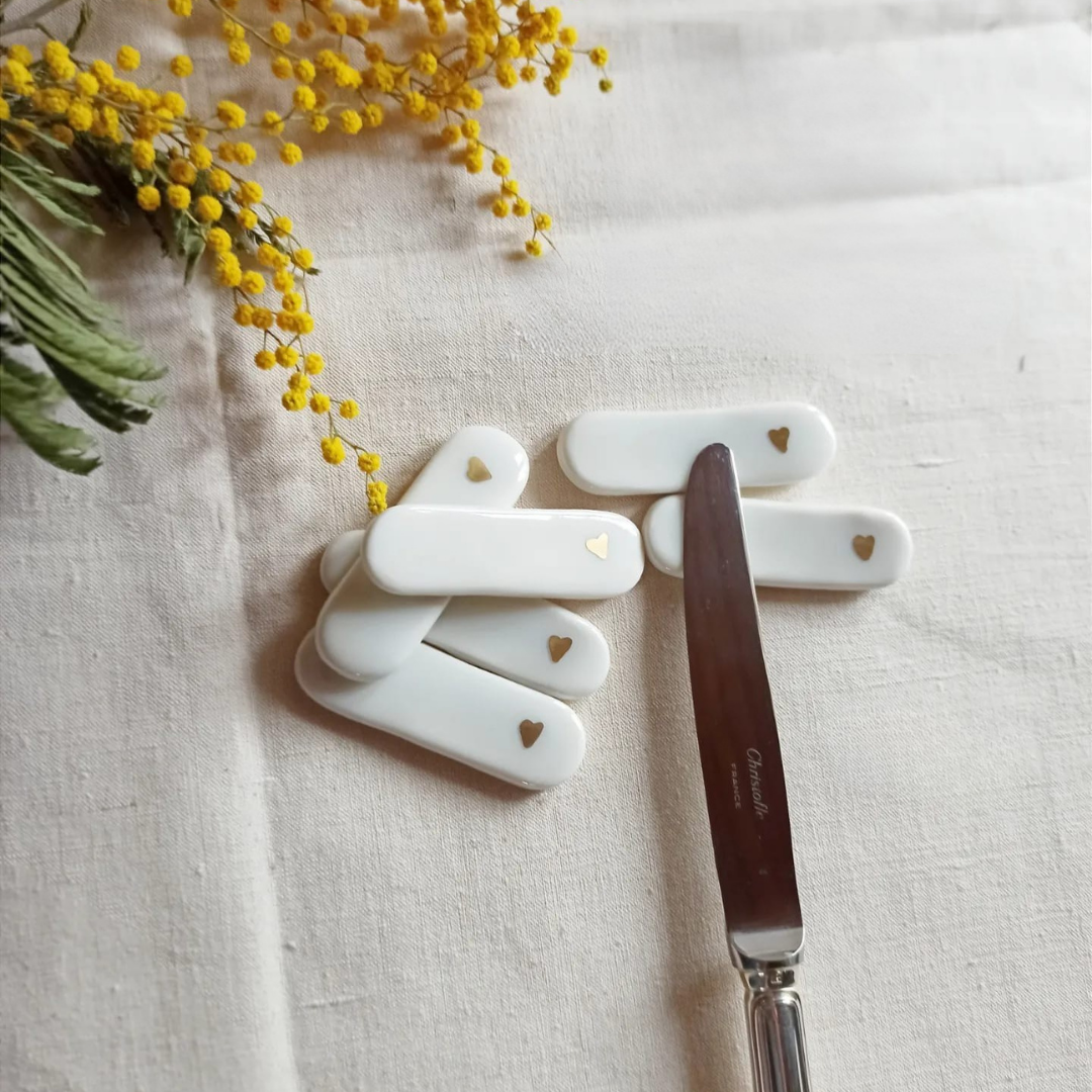 Porte couteaux porcelaine, arts de la table, porte couteaux coeurs, décoration de table céramique, repose couteaux porcelaine et or, repose couverts, accessoires de table, St Valentin, décoration table de fête, décor porcelaine artisanale, porte couteaux blancs, jolie table, couverts, cadeaux St Valentin, idées cadeaux de Noël, déco porcelaine, déco céramique, cadeau chic, cadeau romantique, céramique et or
