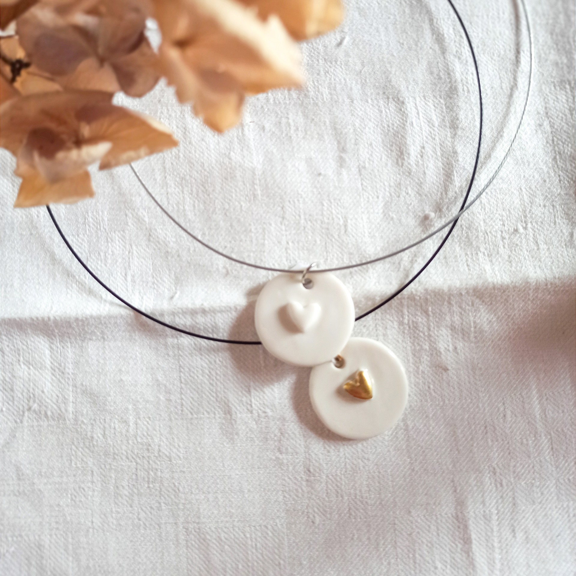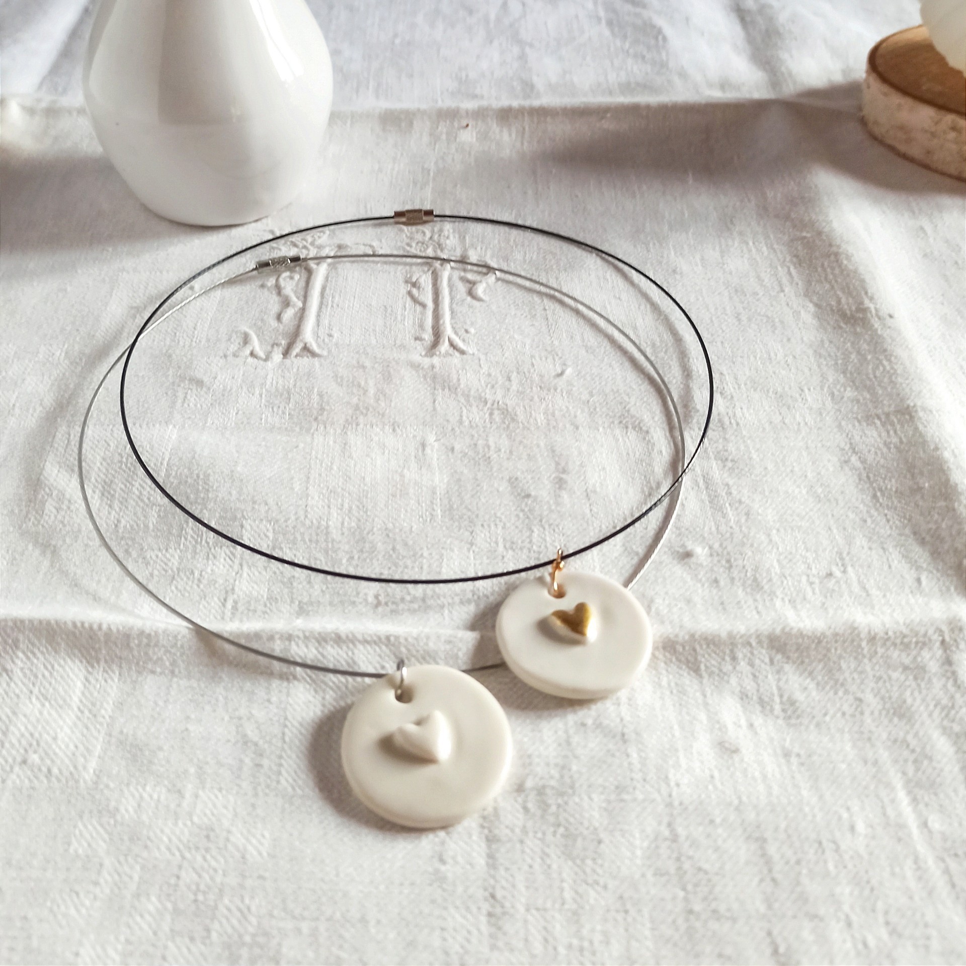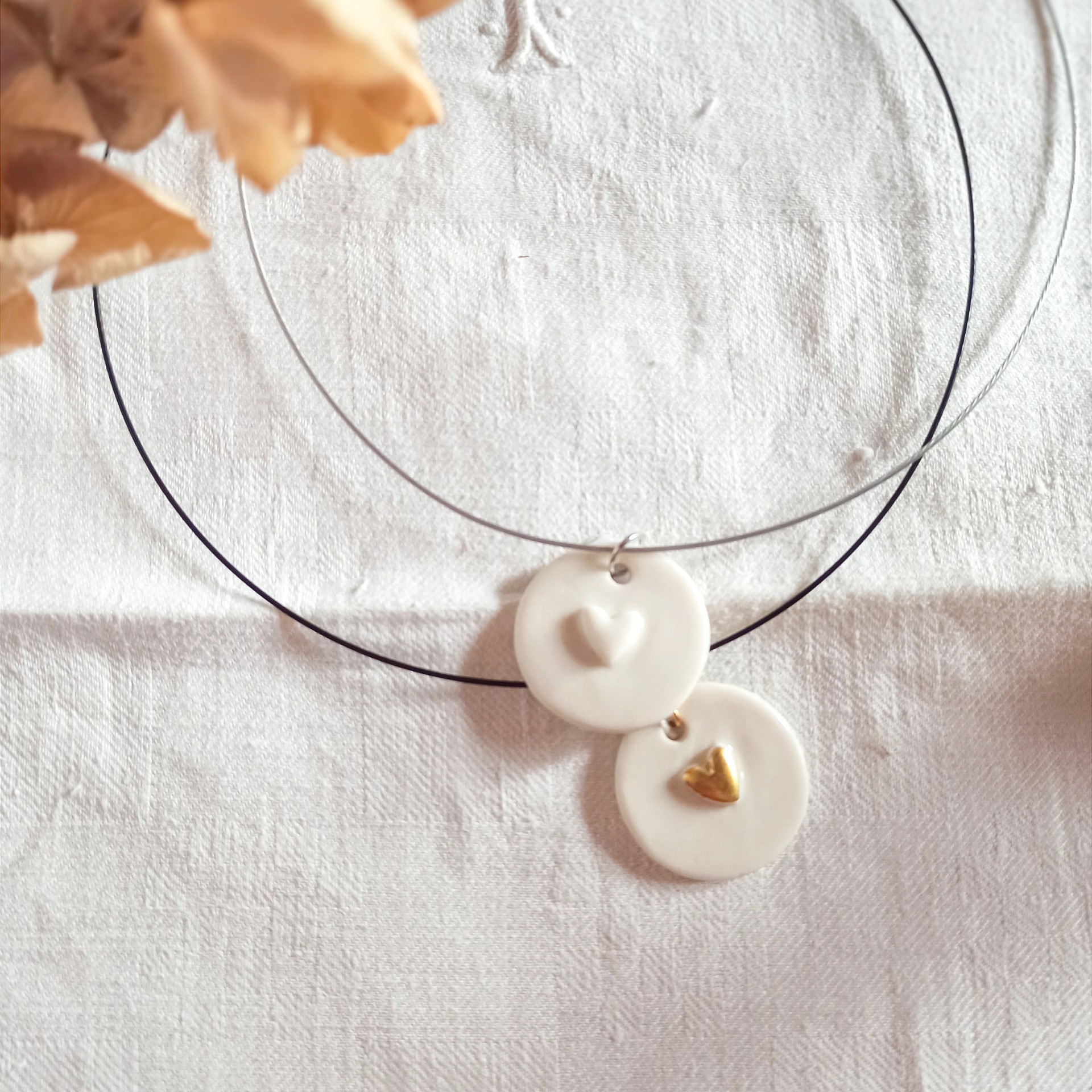 Deux ras de cou très légers, montés sur, un torque doré ou noir en acier inoxydable selon le modèle choisi, orné d'un pendentif en porcelaine blanche émaillée