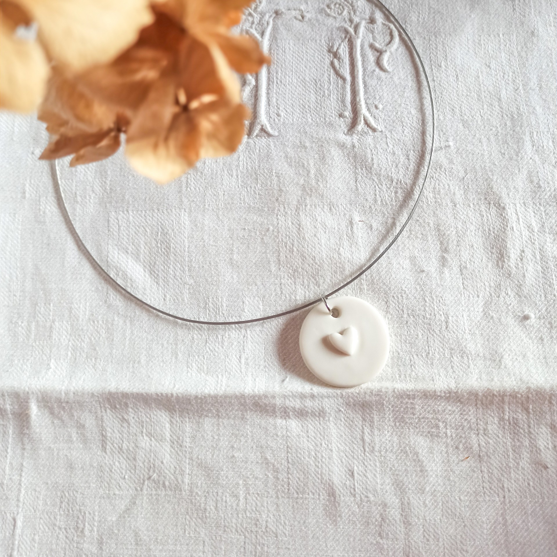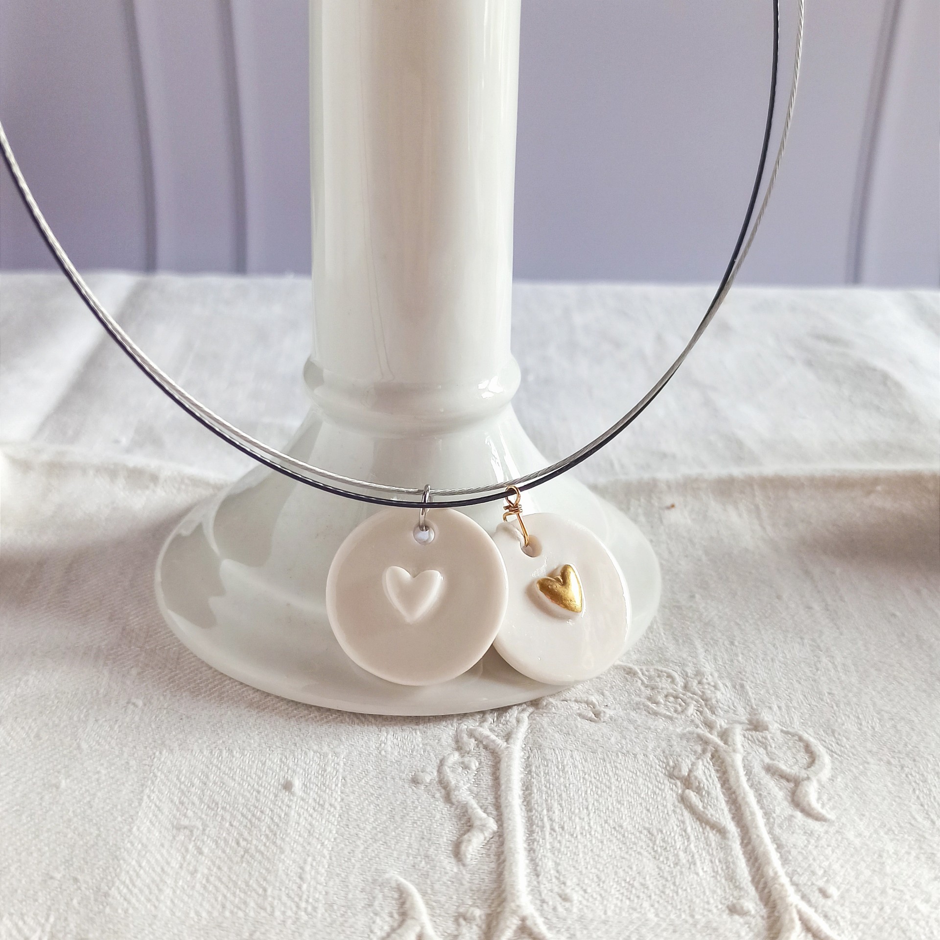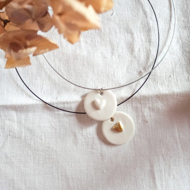 Deux ras de cou très légers, montés sur, un torque doré ou noir en acier inoxydable selon le modèle choisi, orné d'un pendentif en porcelaine blanche émaillée