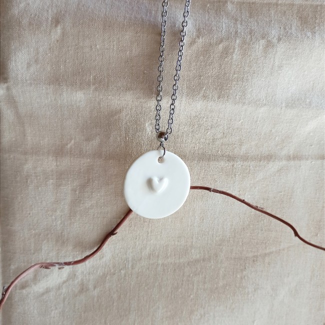 Collier mi long, monté sur une chaîne en acier inoxydable argenté, ornée d'un pendentif en porcelaine blanche émaillée, réalisé à la main dans mon atelier et cuit dans un four céramique en 2 temps jusqu'à 1260°