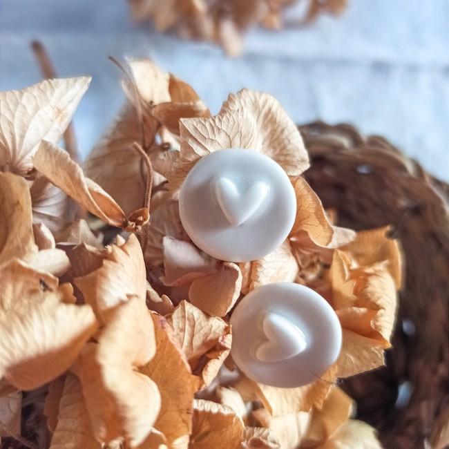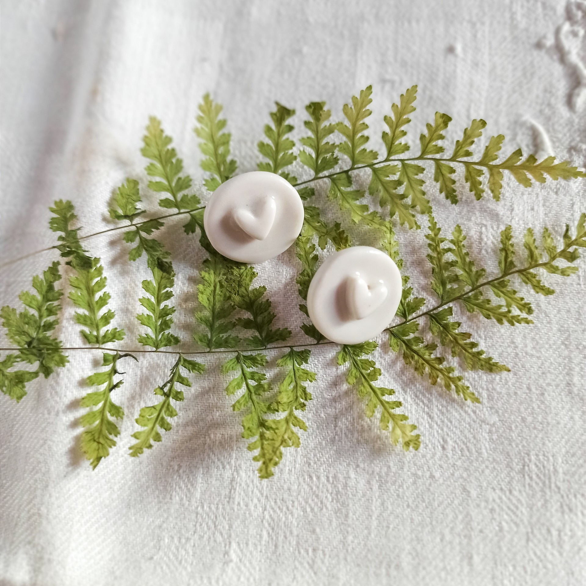 Chacune est composée d'un cabochon rond, de 2 cm de diamètre, en porcelaine blanche, orné d'un petit coeur :