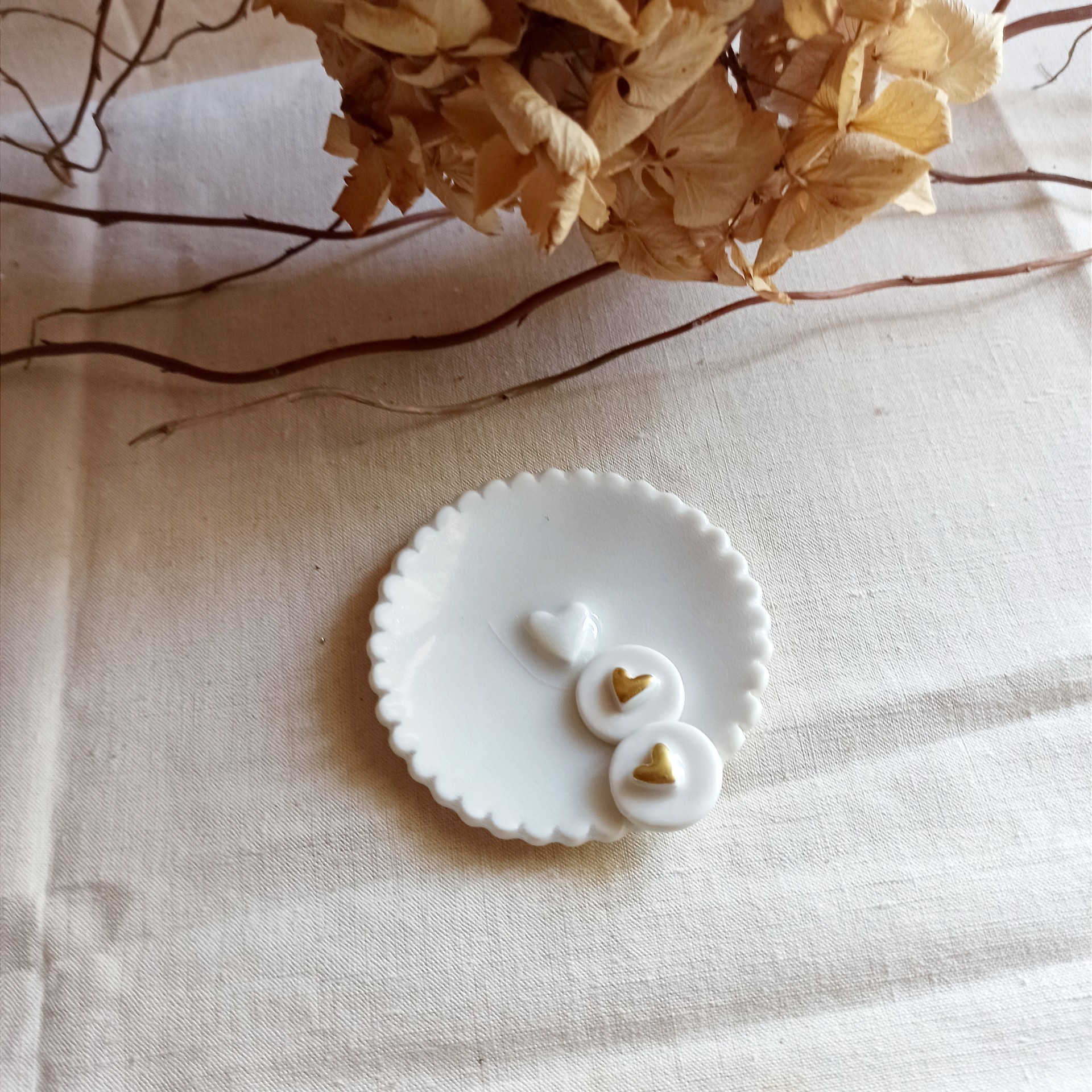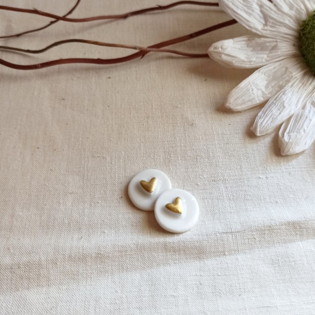 Boucles d'oreilles en céramique, puces porcelaine blanche, porcelaine et or, or, boucles blanches et dorées, boucles porcelaine artisanale blanche, boucles minimalistes, boucles poétiques, boucles porcelaine et acier inoxydable, boucles porcelaine, bijou porcelaine, boucles coeurs, coeurs or, idée cadeau fête des mères, bijou mariée, bijou mariage, clous d'oreilles élégants, bijou chic, mariage minimaliste, cadeau femme, cadeau anniversaire, cadeau Noël, cadeau St Valentin