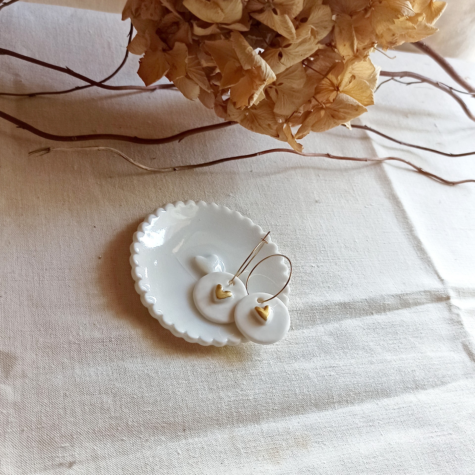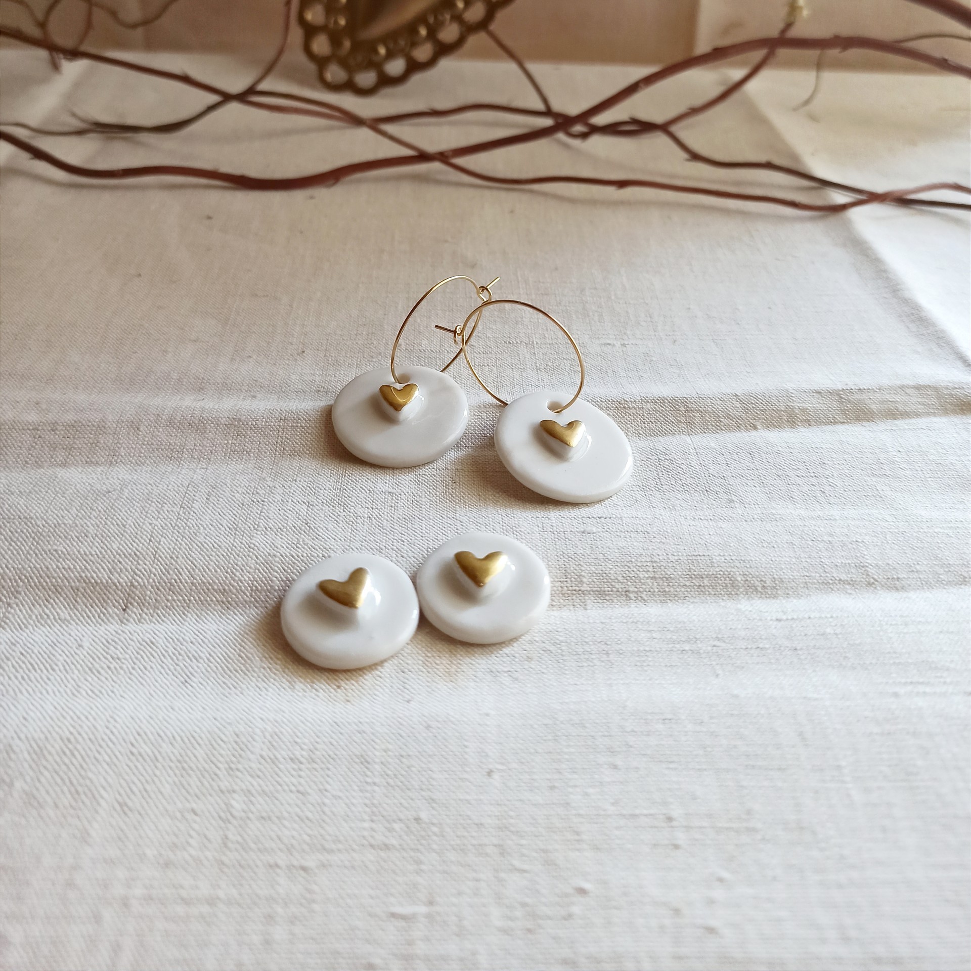 Boucles d'oreilles porcelaine et acier inoxydable, boucles d'oreilles pendantes, boucles d'oreilles porcelaine, porcelaine blanche, boucles d'oreilles acier inoxydable, créoles porcelaine, pendentifs céramique, boucles d'oreilles céramique faite main, boucles d'oreilles blanches et or, bijoux céramique, bijoux porcelaine, pour oreilles percées, créoles acier inoxydable doré, cadeau St Valentin, cadeau fête des mères, bijou mariage