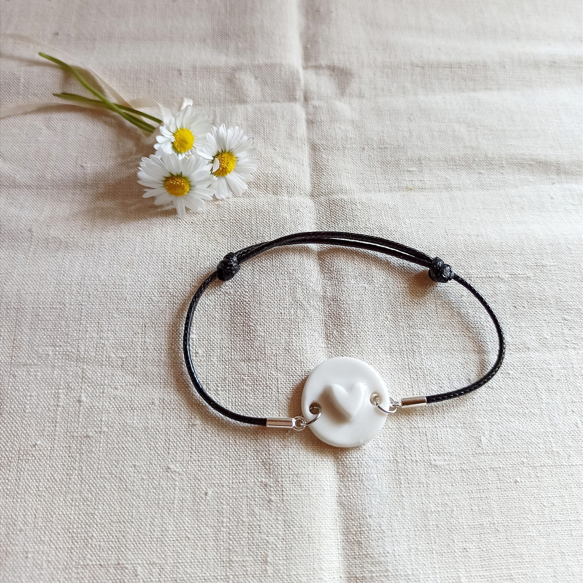 Bracelet céramique, bracelet porcelaine, bracelet réglable, bracelet ajustable, bracelet cordon, connecteur porcelaine, bracelet minimaliste, bracelet noir, bracelet souple, collection coeur, coeur, bracelet coeur, cadeau St Valentin
