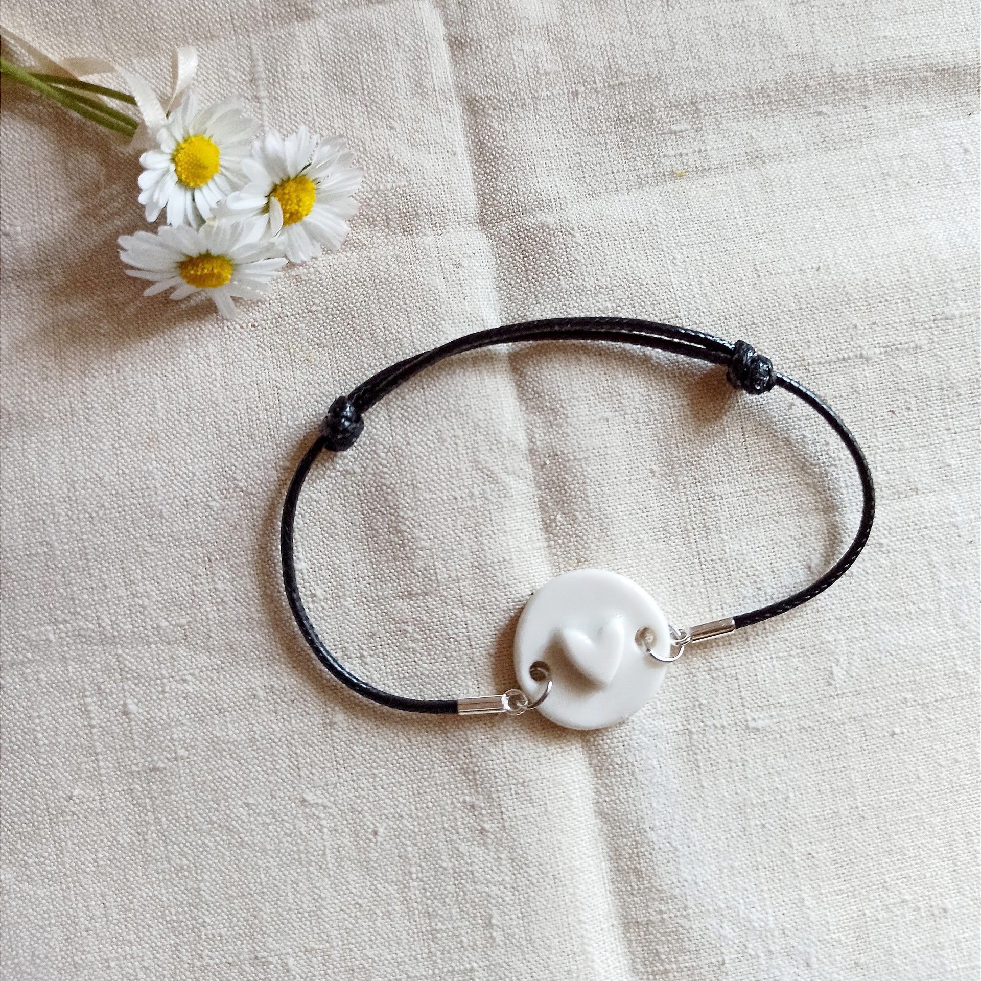Bracelet réglable, léger, composé d'un connecteur en porcelaine blanche émaillée, orné d'un petit coeur en son centre, de 2 cm de diamètre, réalisé à la main dans mon atelier et cuit dans un four céramique en 2 temps jusqu'à 1260°