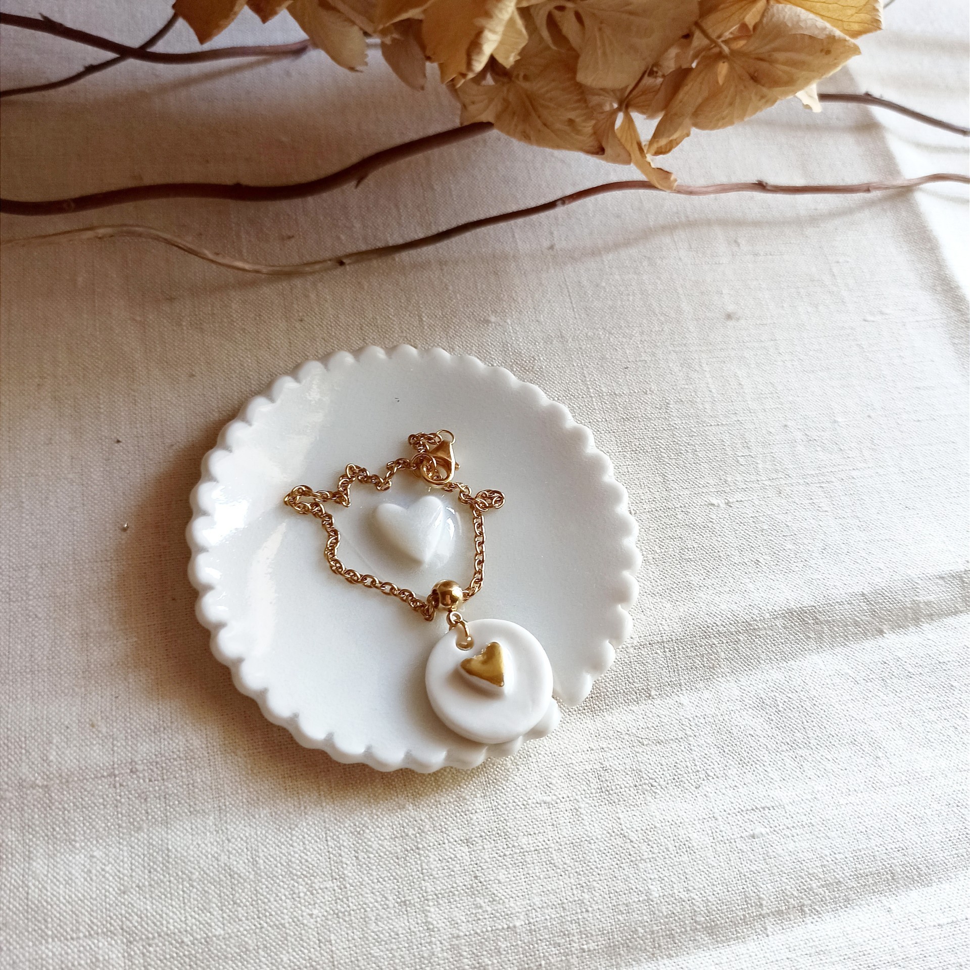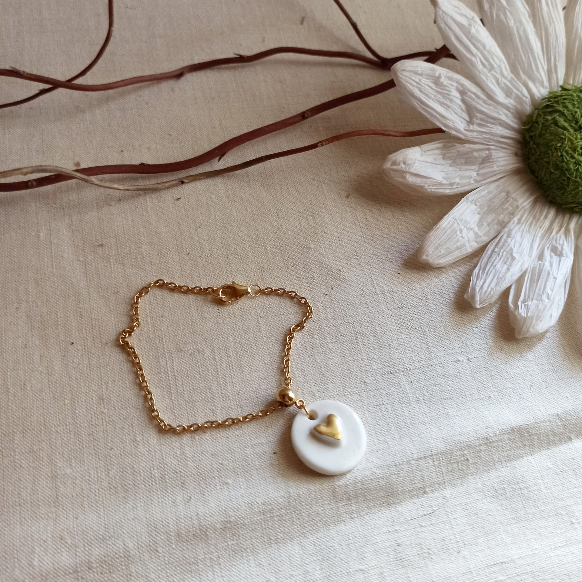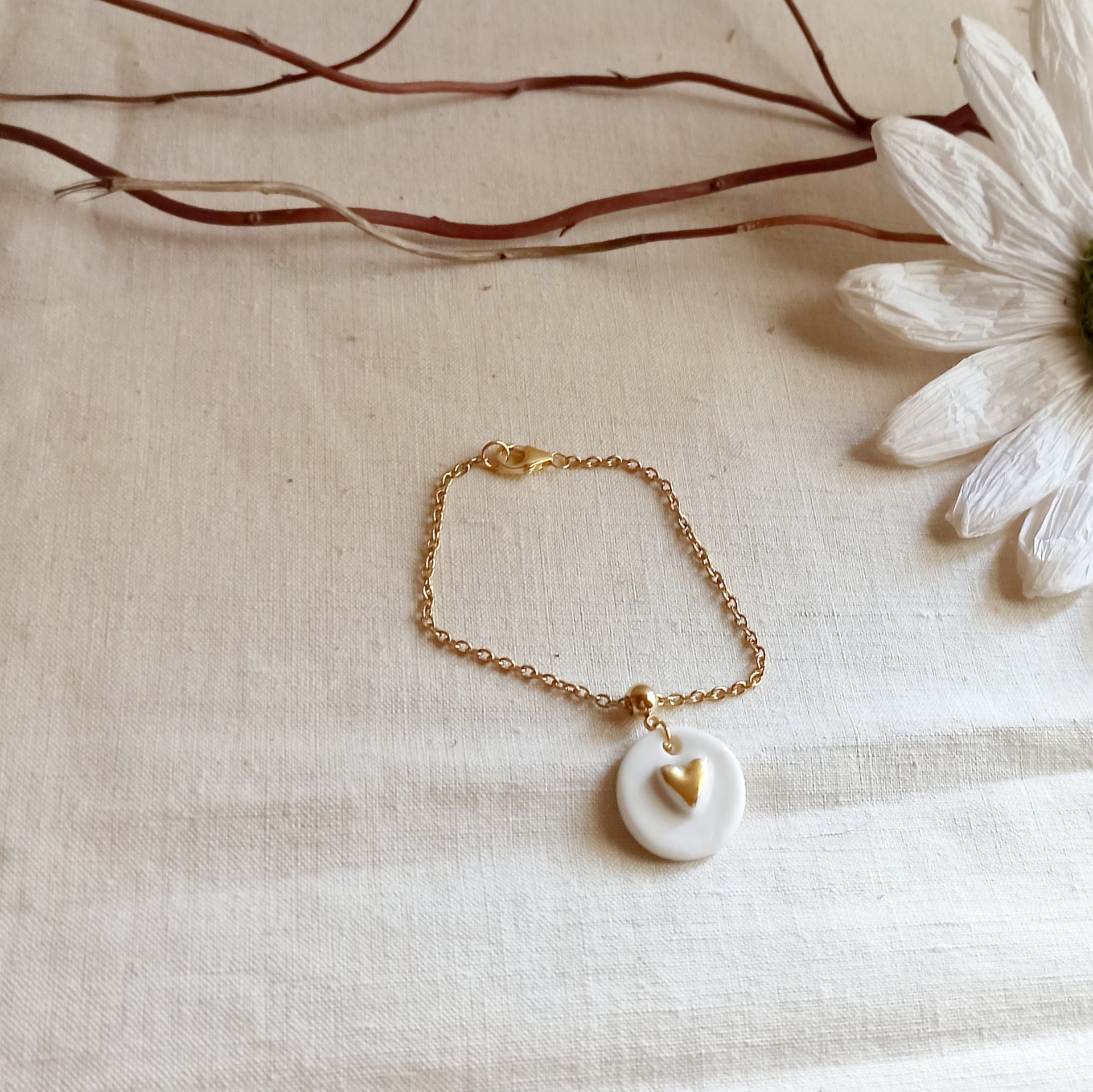 Bracelet céramique, bracelet porcelaine, porcelaine et or, céramique faite main, pampille céramique, pampille porcelaine, bracelet blanc et doré, bracelet fin, bracelet chaîne, cadeau St Valentin, cadeau fête des mères, bracelet mariage, bijou mariée, bijou mariage, bracelet doré et blanc, bracelet souple , collection coeurs, bijou porcelaine, bijou céramique, bijou créateur, fibule et cabochon