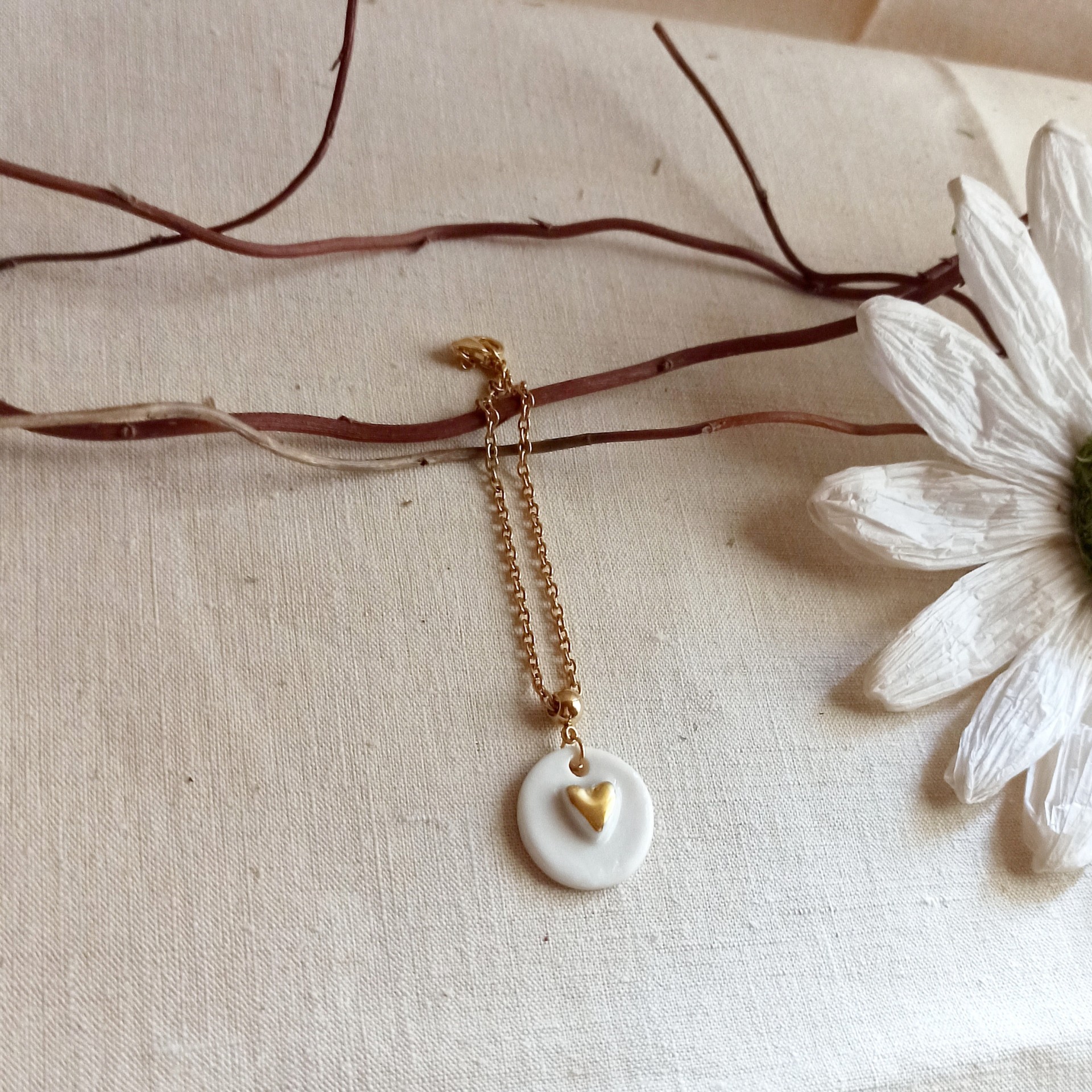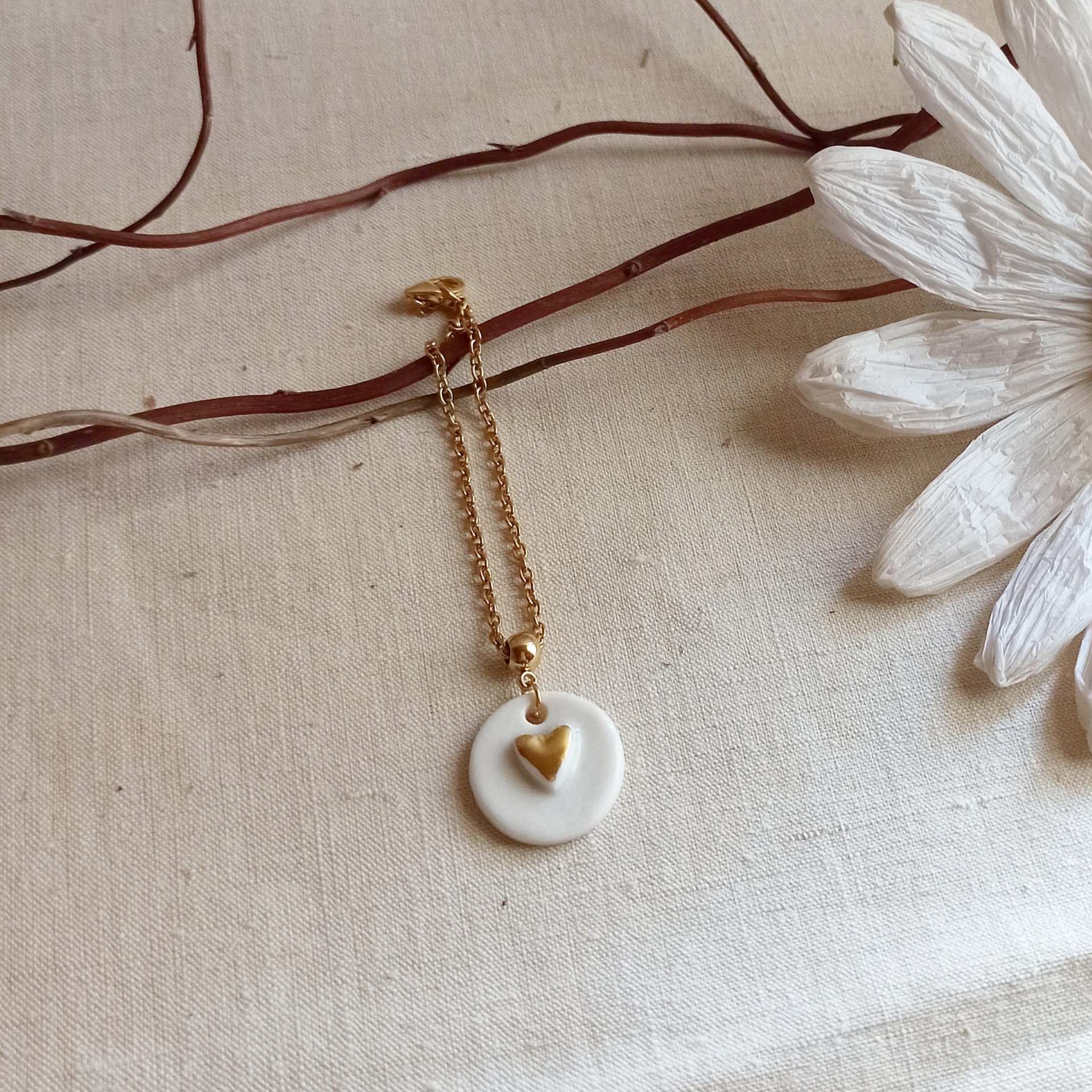 - d'une pampille en porcelaine blanche émaillée : médaillon rond de 2 cm de diamètre, orné d'un petit coeur peint à l'or et réalisé à la main dans mon atelier
