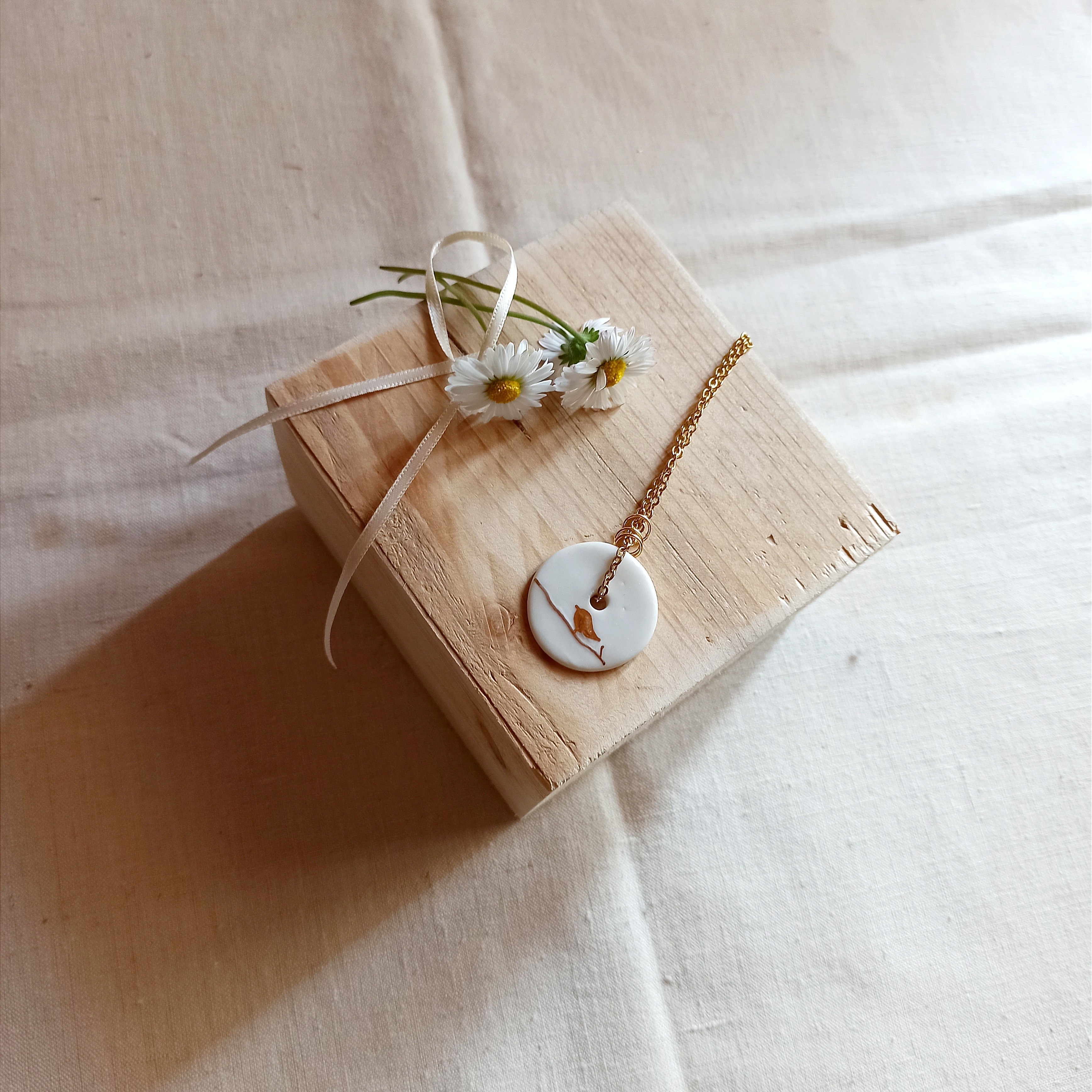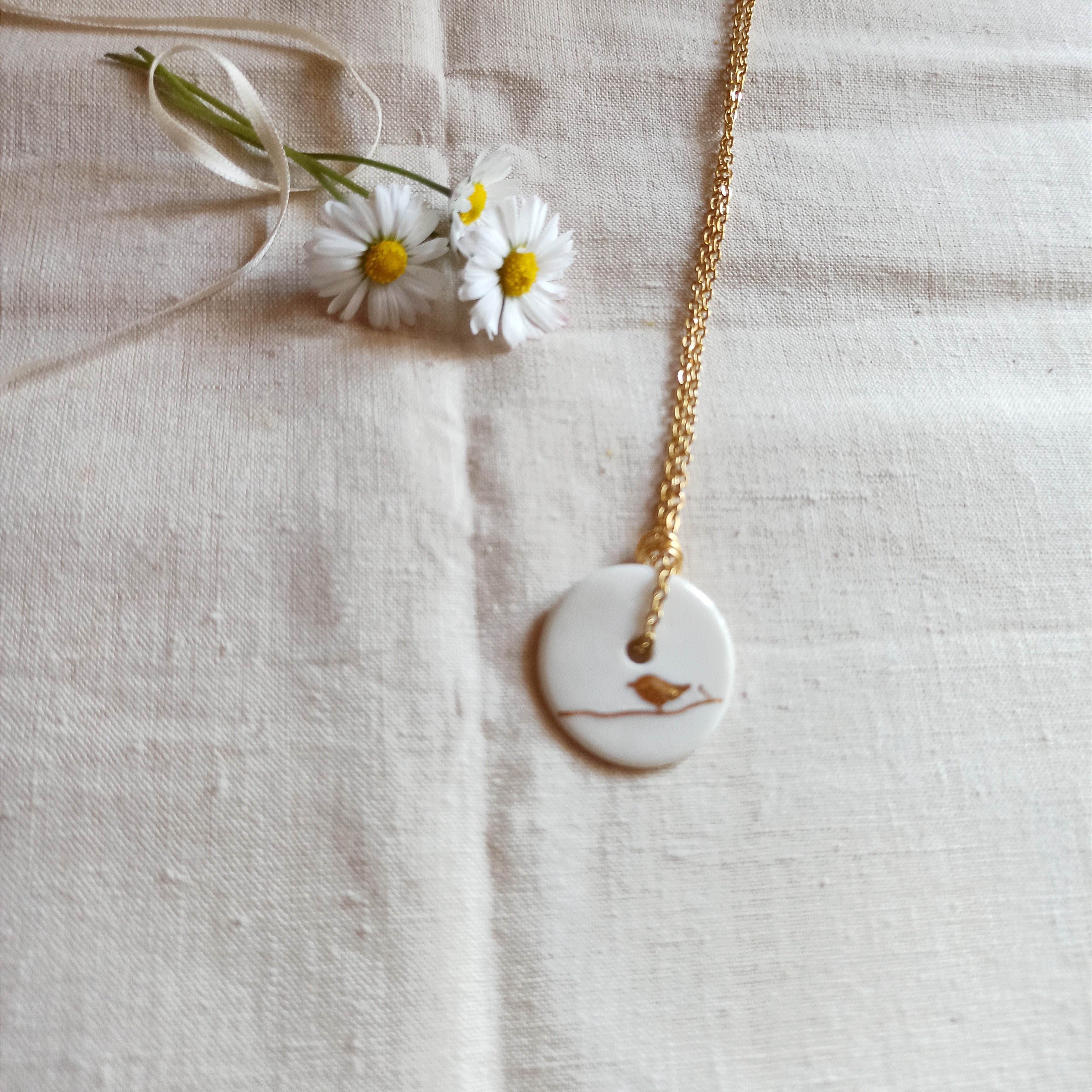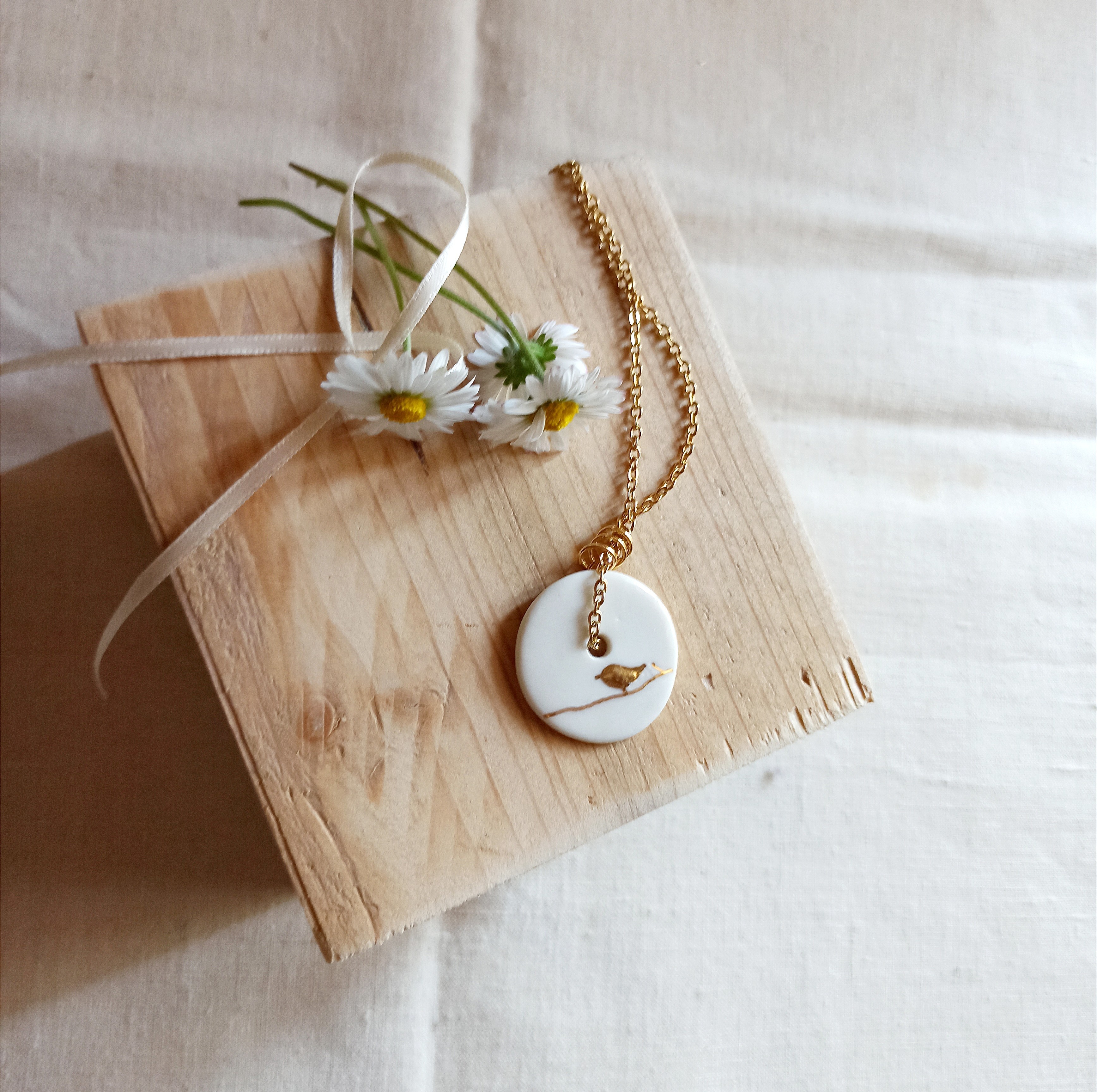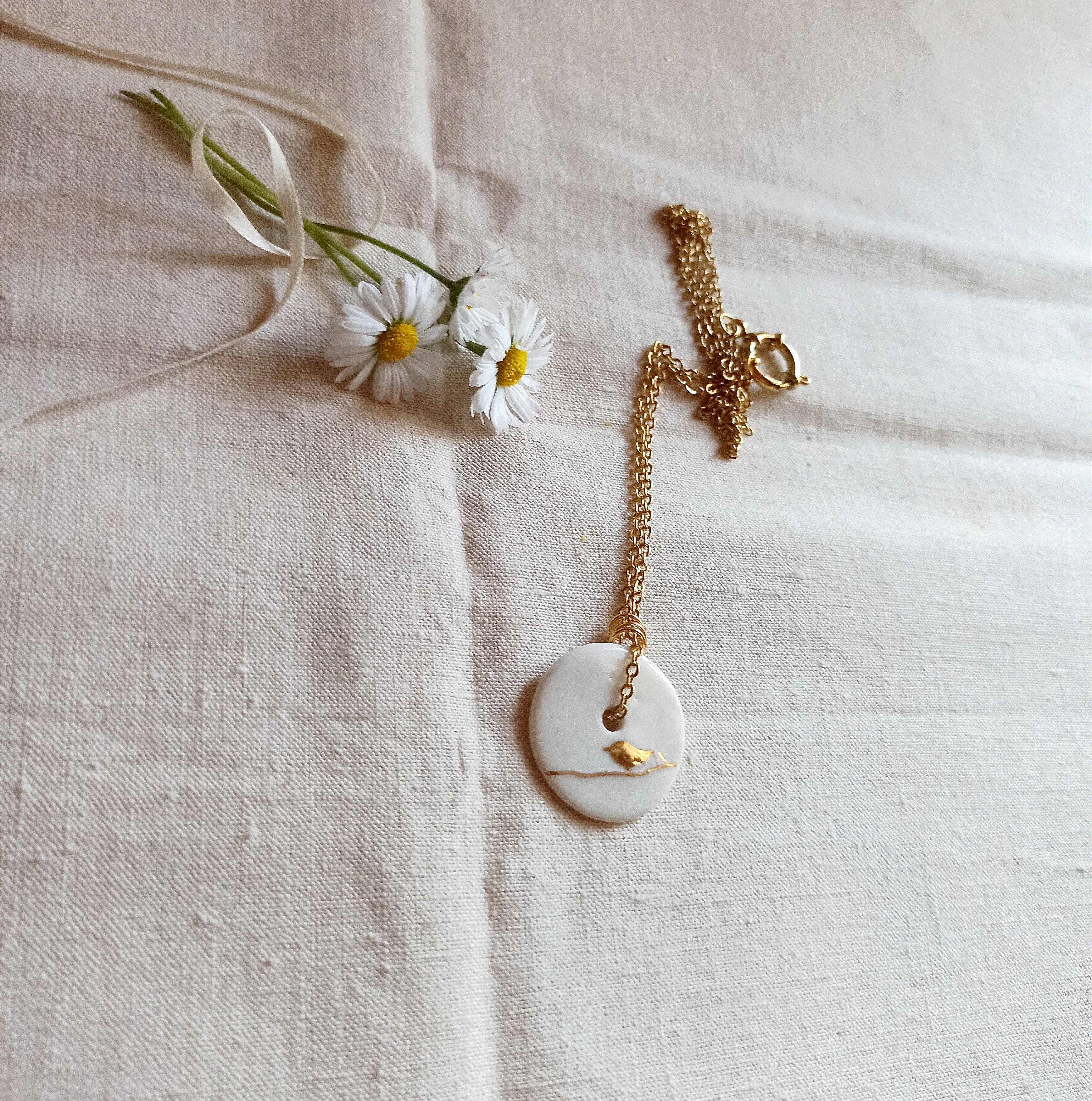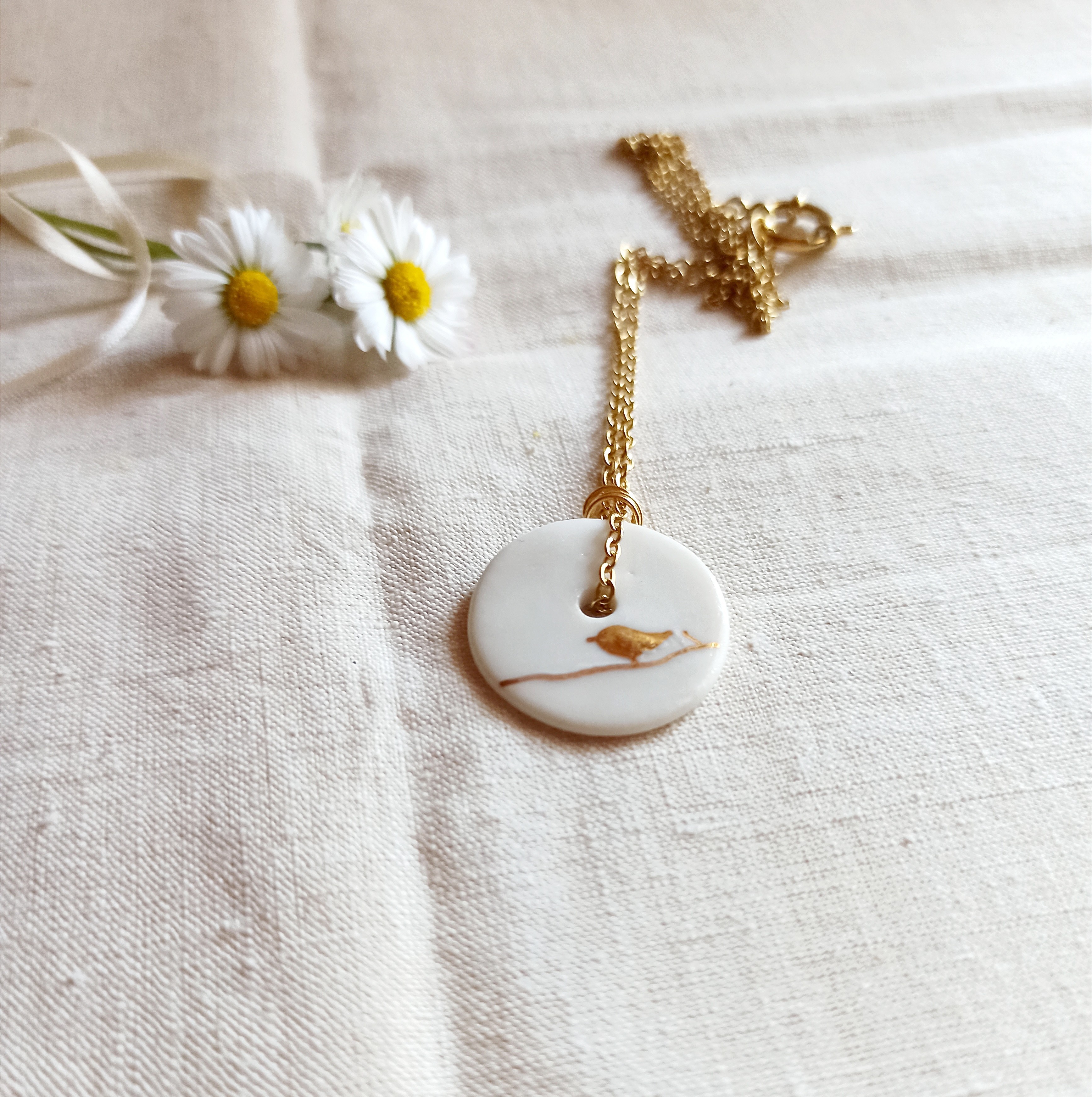 Ce collier en céramique émaillée est façonné à la main, puis décoré d’un oiseau à l’or, posé sur une branche fine.