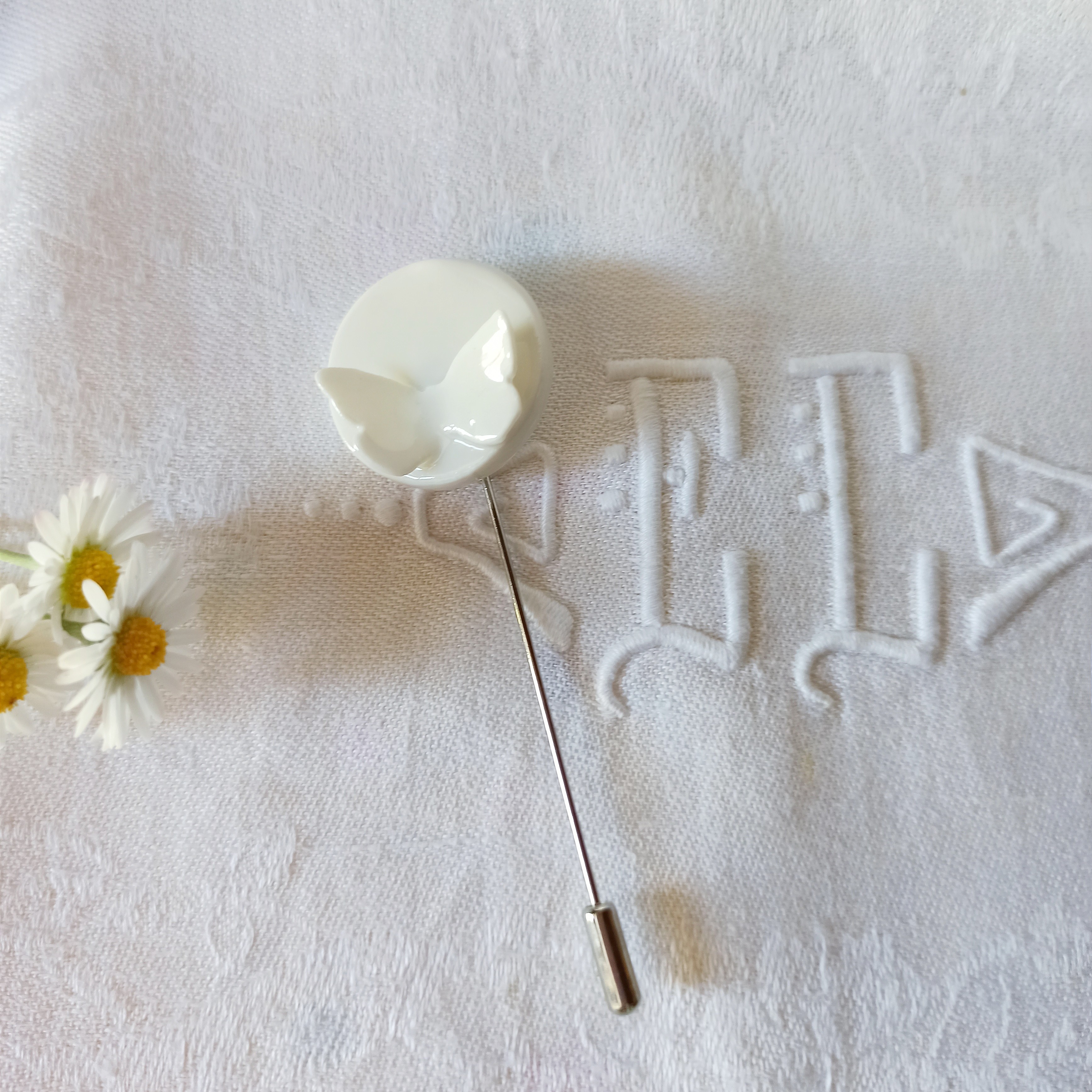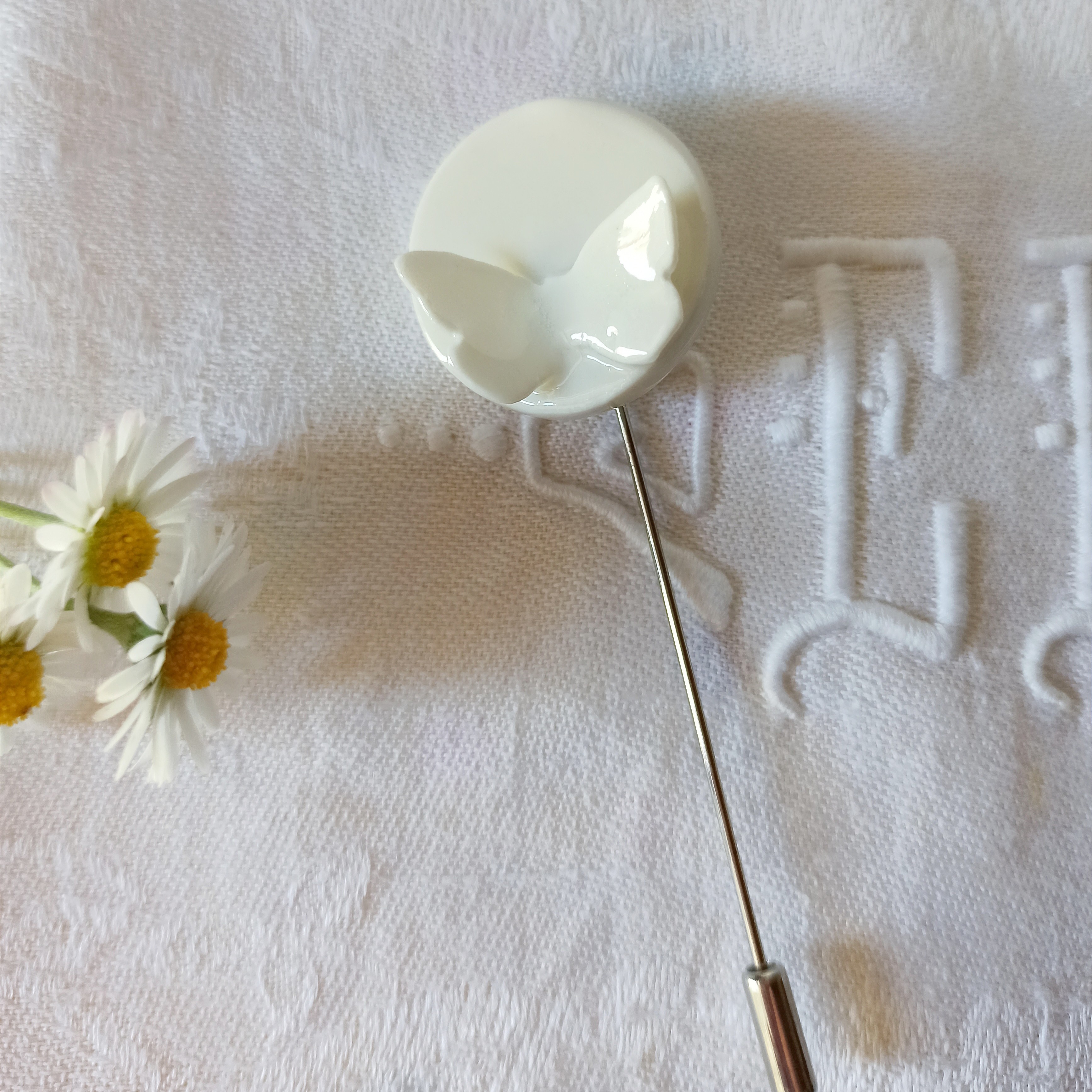 Fibule en céramique composée d’un cabochon rond en porcelaine blanche émaillée, orné d’un papillon en relief, montée sur une épingle en métal argenté.