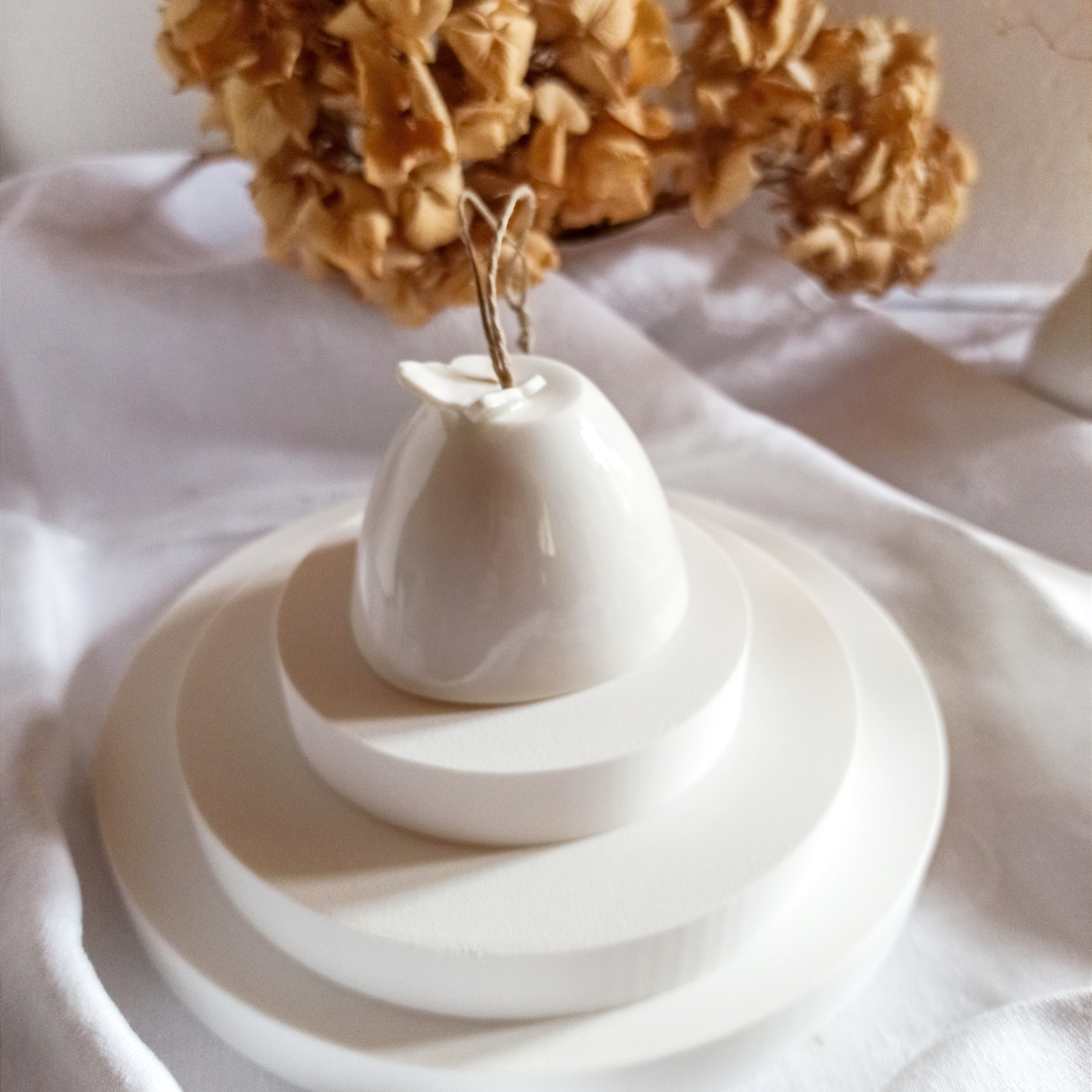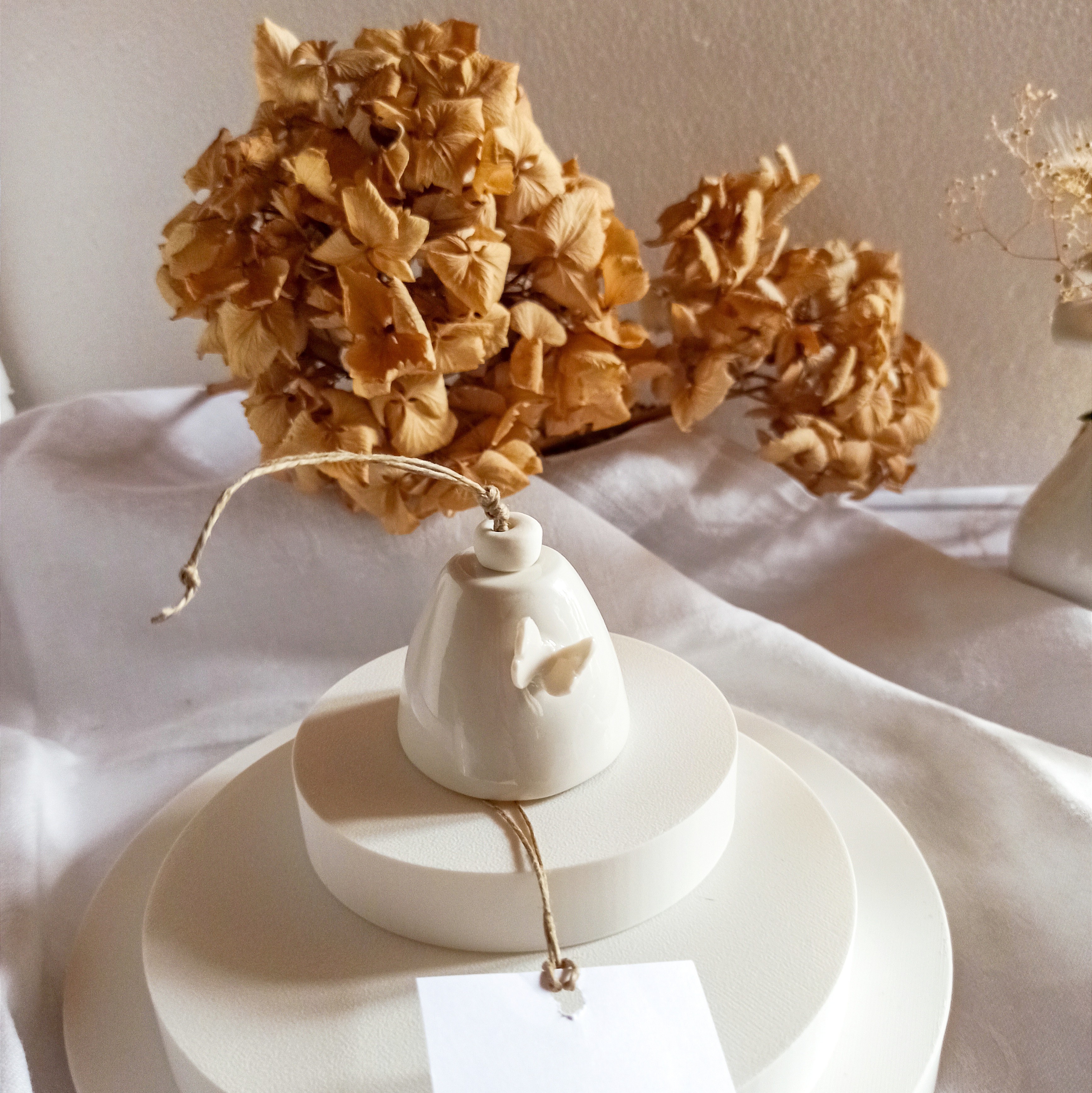 Façonnées à la main en porcelaine blanche émaillée, elles se balancent doucement au gré du vent, diffusant une présence discrète, presque silencieuse, comme un battement d’ailes.