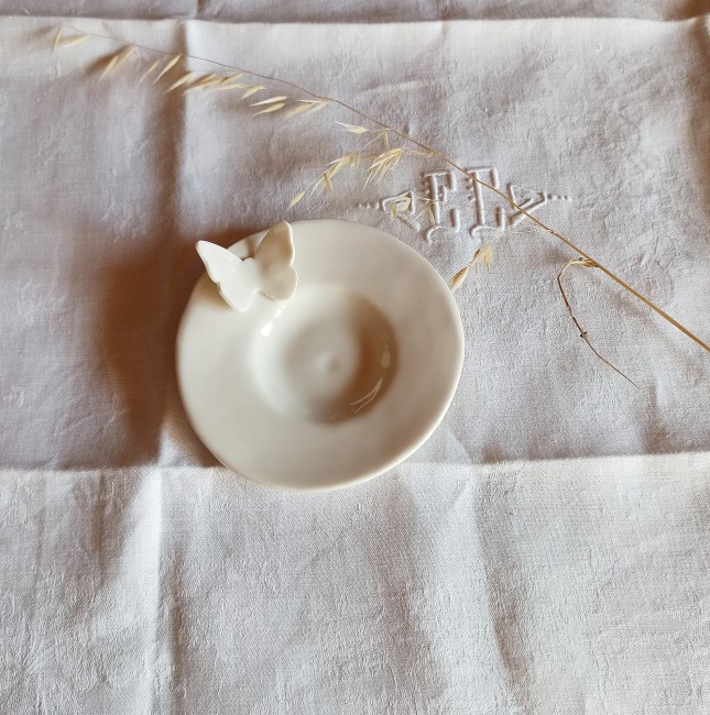 Chaque pièce est ornée d’un papillon, symbole de légèreté et de transformation, posé comme un instant suspendu.